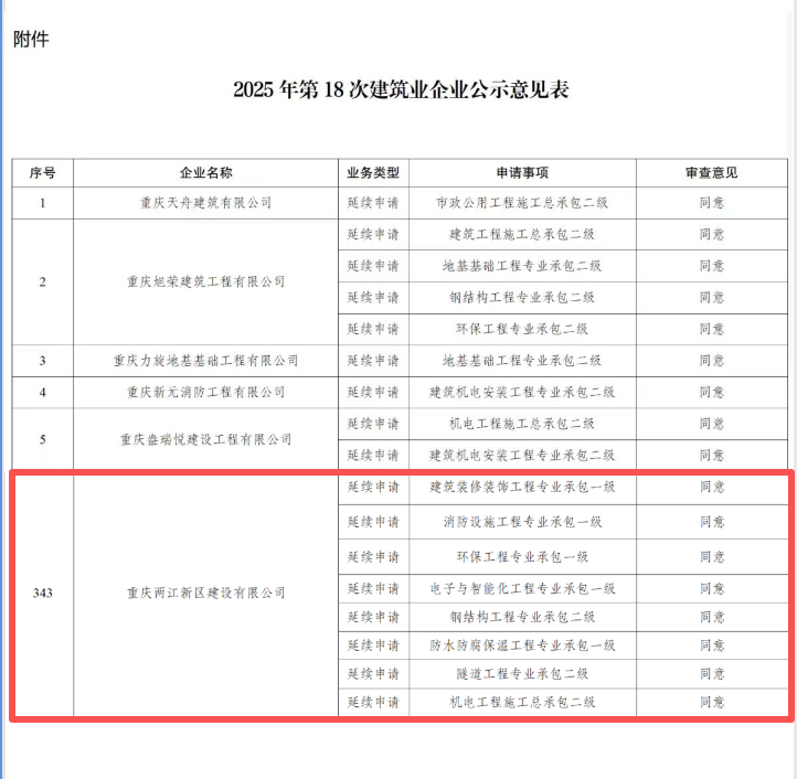 近日,重慶市住房和城鄉(xiāng)建設(shè)委員會正式發(fā)布《2025年第18批次建筑業(yè)企業(yè)資質(zhì)審查意見公示》,重慶兩江新區(qū)建設(shè)有限公司申報的建筑業(yè)企業(yè)資質(zhì)已通過市級主管部門的嚴(yán)格審查,進入公示階段。
